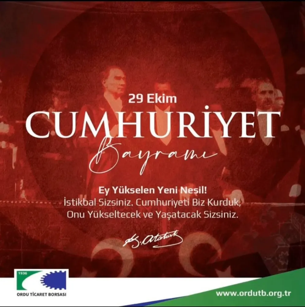 Ordu Ticaret Borsası Yönetim Kurulu Başkanı Ziver Kahraman, 29 Ekim Cumhuriyet Bayramı'nın 101. yıl dönümünü kutladı.