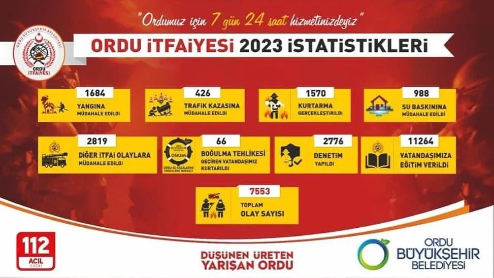 Ordu Büyükşehir Belediyesi İtfaiye Dairesi Başkanlığı 2023 yılında il genelinde 1684’ü yangın, 426’sı trafik kazası, 1570’i insan ve hayvan kurtarma, 988 su baskını, 66 boğulma tehlikesi ve 2819’u diğer itfai olaylar olmak üzere toplam 7553 olaya müdahale etti. Yıl boyunca 2776 denetim yapan ekipler, 11 bin 264 vatandaşa da eğitim verdi.